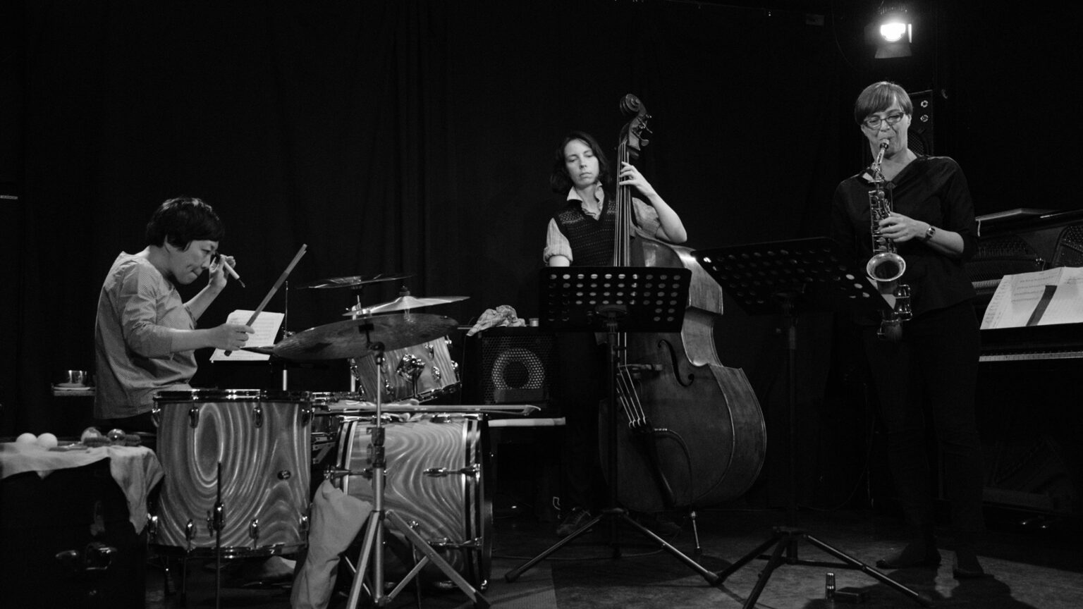 Hailing from the homeland of drummer Yuko Oshima, who has been based in France since the early 2000s, this brand-new group takes its name from the Japanese word for “happiness”: Satchi. Anchored by Oshima’s energetic grooves, the trio unites two powerful voices from the young German (free) jazz scene: saxophonist Silke Eberhard and double bassist Maike Hilbig. Satchi creates music in the moment, driven by deep connection and the pure joy of playing. (jazzdor in 2020)