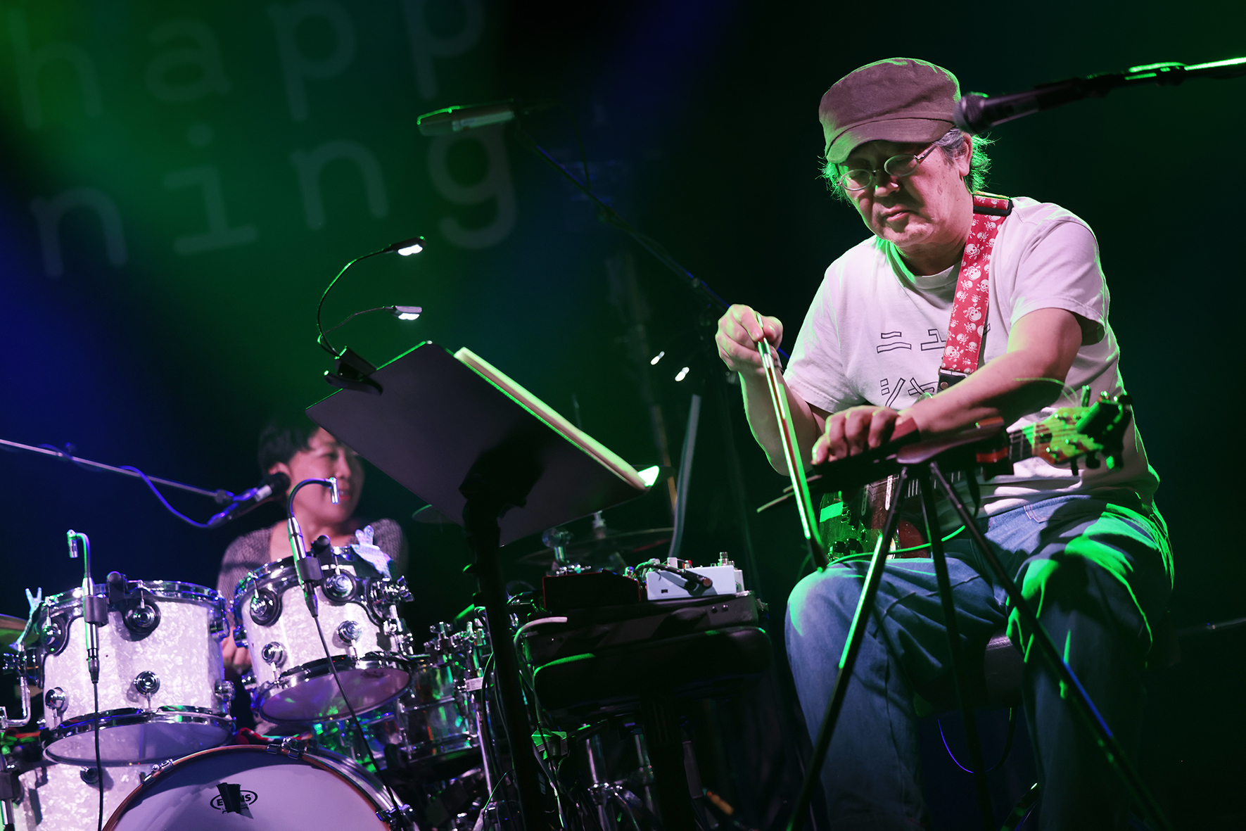 Tout aussi vertigineux ici-bas, Uchihashi et ses machines, Lété jouant au Rubik’s Cube avec les pièces de percussions posées sur le manche de sa basse. Oshima ramène, elle aussi, son monde sur la Terre ferme. Solidement terriens, ses chants de nagauta, langoureux, poussent le set dans une dramaturgie rituelle.
